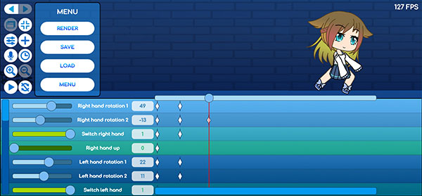 3、上方操作完成之后即可进入动画编辑界面,因为该方面功能较多,就不过多介绍,大致说下功能区块,左下方为角色动作区域,通过文字左侧的滑钮即可调整上方角色的动作,与姿势编辑类似,而右侧则是时间轴,例如我们调整了右手移动,同时在右侧时间轴中创建一个新的区域的话,那么右手就会在该时间内移动。