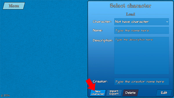 2、来到下图界面后点击下方的New character来创建我们的新角色(也可以使用Import/Export来导入/导出角色)。