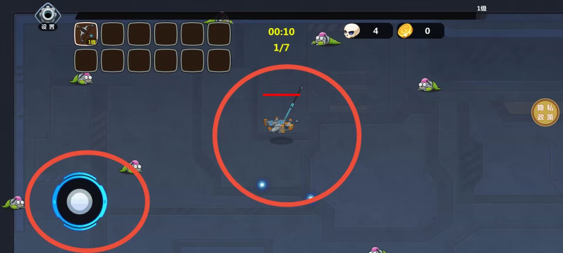1、游戏界面顶部显示当前敌人波次信息,左下角为移动控制区域,角色生命值位于上方,遭遇大量敌人时可选择战术性撤退。