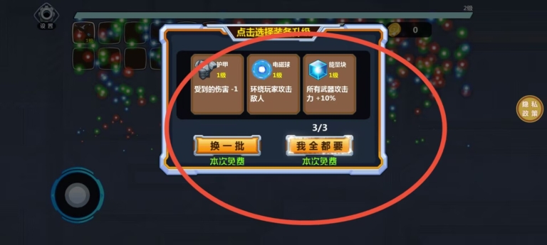 2、角色拥有自动攻击功能,击败敌人后会掉落蓝色能量球,收集这些能量球可以填充顶部的进度条,当进度条蓄满时,将触发技能选择或升级界面。