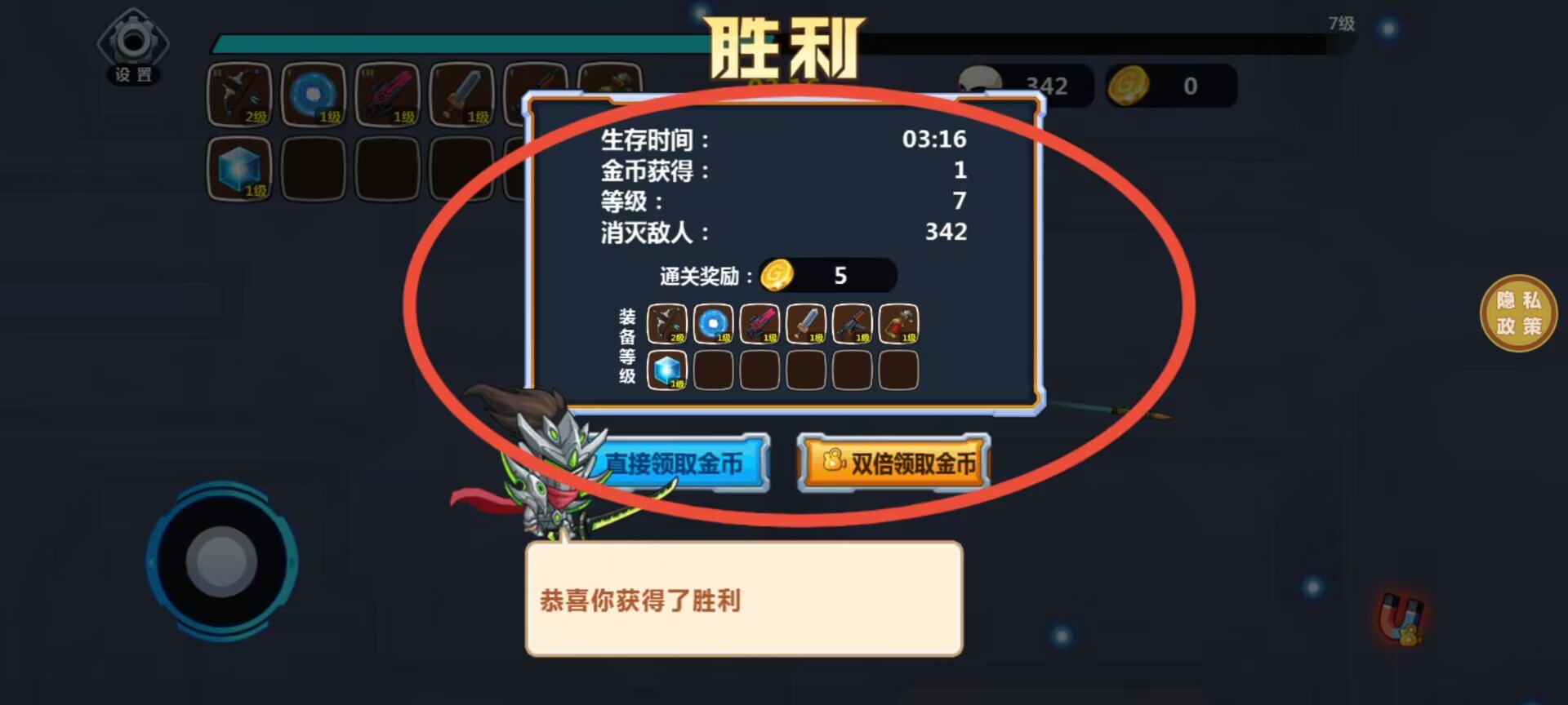 3、成功抵御七波敌人进攻后通关,结算界面详细展示生存时长、金币收益、等级提升及击杀数量等数据。