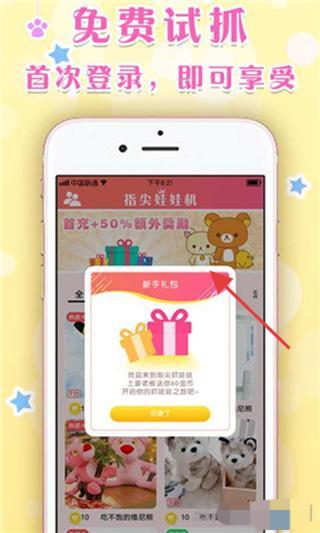 2、首次登录,领取免费试抓机会,进入机器,开始抓娃娃体验。