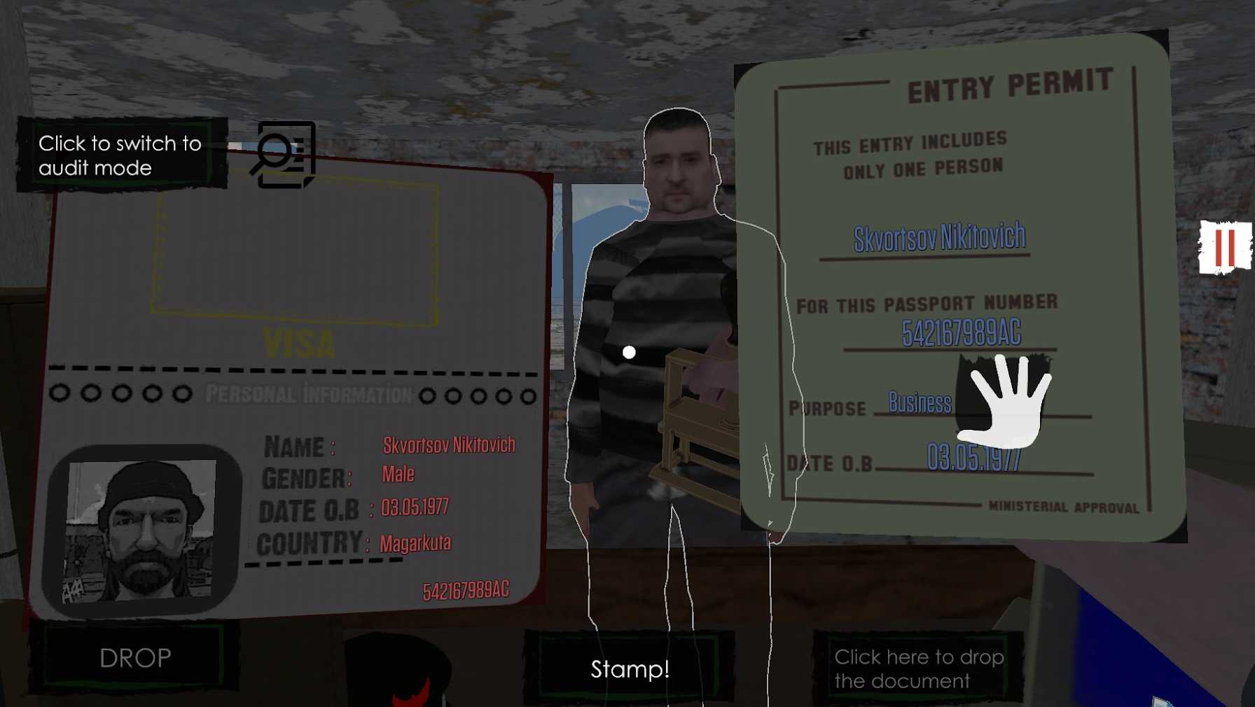 3、游戏中设置了丰富的场景,例如某些证件上的信息可能存在错误或者伪造痕迹,这时就需要玩家运用智慧判断并果断拒签。而当所有信息核对无误后,则可以盖章放行。