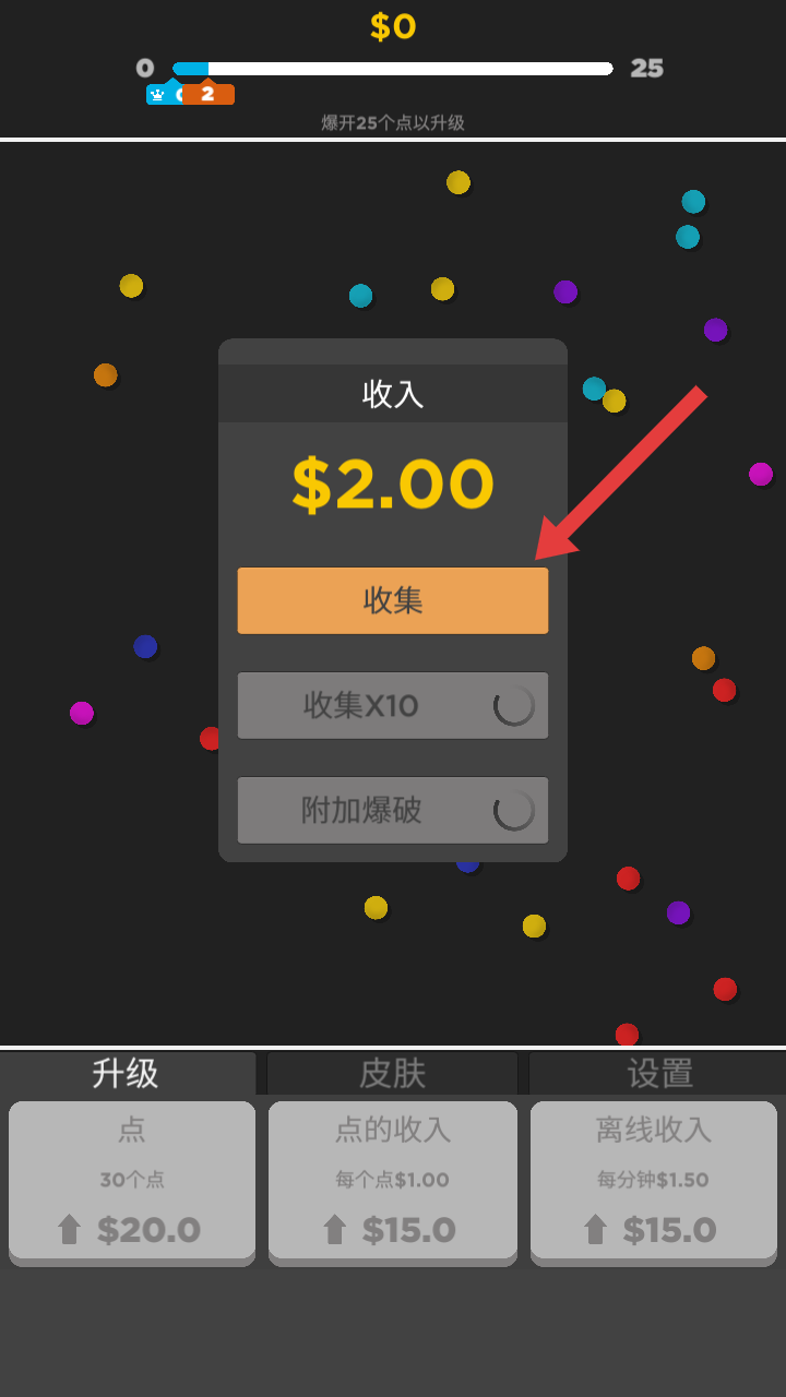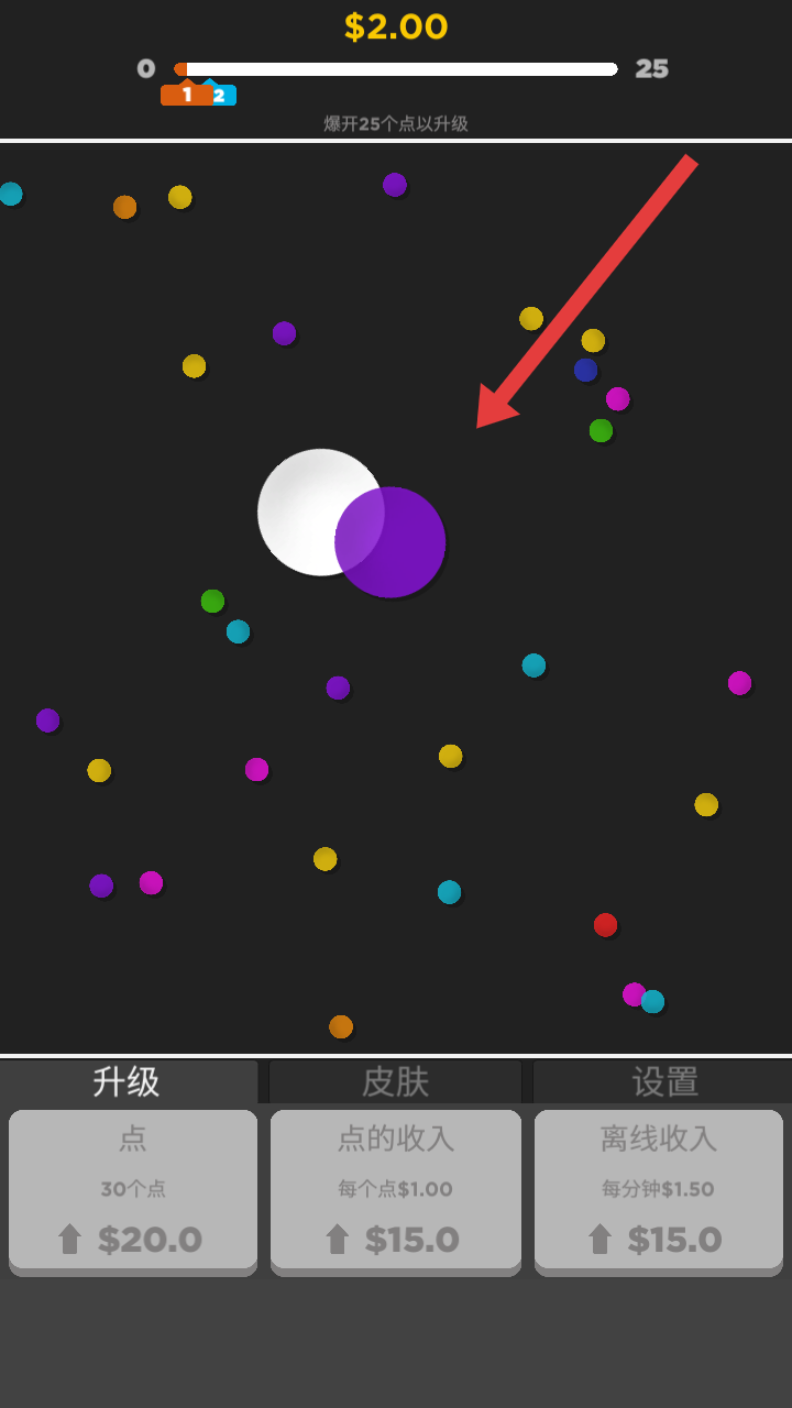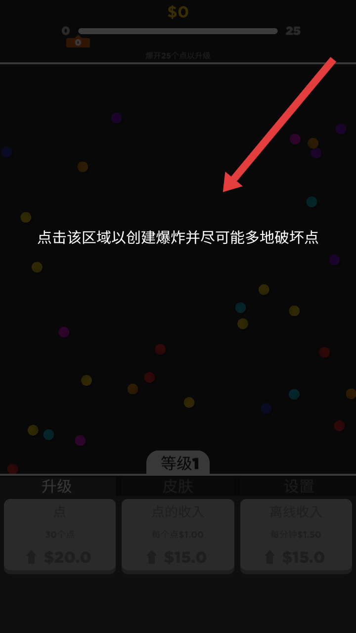 1、点击屏幕上的彩色点区域,引发爆炸,尽量摧毁更多的彩色点,累积破坏数量(目标是达到25个以升级)。