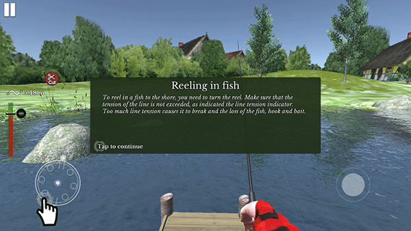 5、钓鱼——要将鱼拉到岸边,你需要旋转卷轴。务必保证线的张力不超过线材张力指示器所显示的范围。如果线过于紧绷,可能会导致断裂,从而丢失鱼、鱼钩和鱼饵。