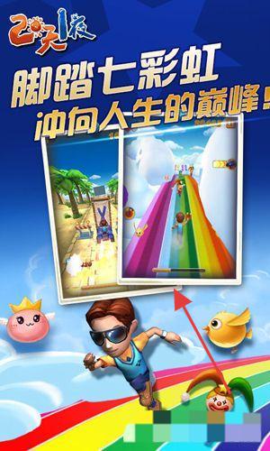 1、控制角色在彩虹跑道上奔跑,避开障碍物,收集道具,冲刺至终点。