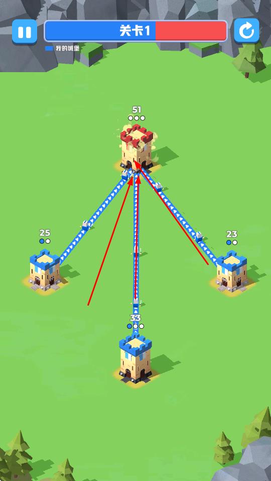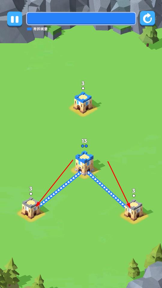 2、在战斗中,通过兵力传输路径,调度各个城堡的部队,支援前线,攻击敌方的红色城堡。