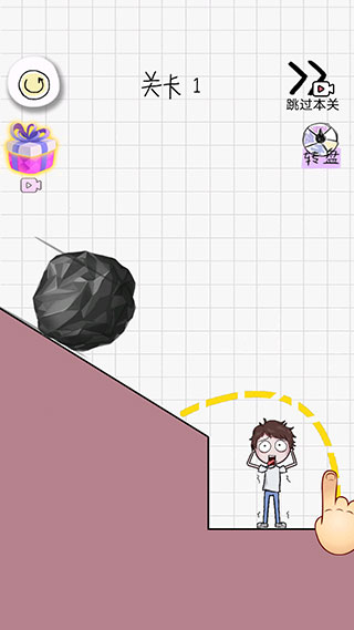 4、进入第三关,可看到人物在谷底,我们需要在他头顶画出一条毛线,