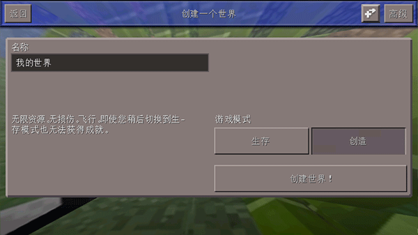 2. 点击“创建新的世界”,从生存模式与创造模式里挑选一种,接着点击创建世界,即可正式进入游戏。