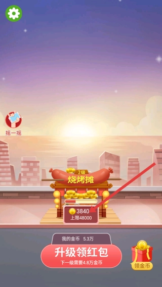 1、优先升级金币上限高的店铺,比如烧烤店,4.8万金币就够升级。点击升级领取红包,能快速提升等级,解锁更多收益。
