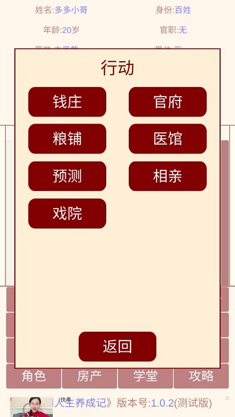 通过游戏界面下方的朝廷、官职、家族、行动、农业、商业、就业、角色、房产和学堂等互动选项,您可以提升官职、积累荣誉并增加财富。