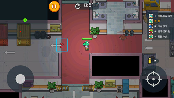5、进入战场后,左上角的小地图会显示敌人位置,左下方的摇杆用于控制角色移动,右侧显示玩家排名,右下角的按钮点击后可进行射击操作。