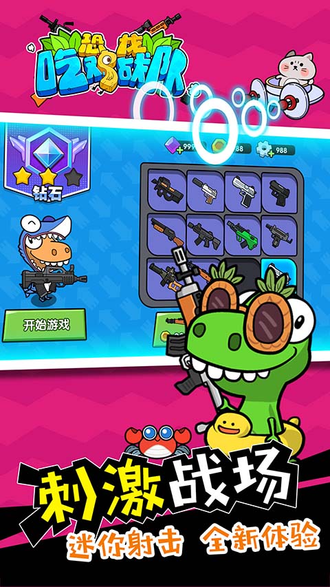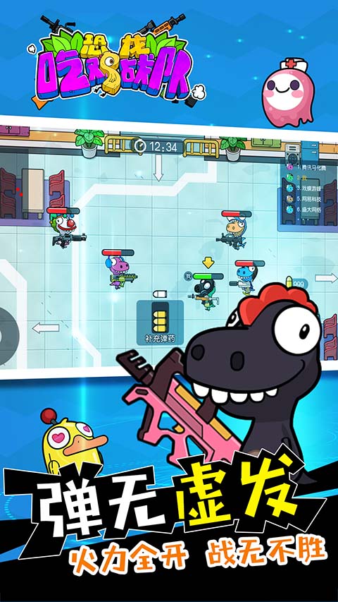 《恐龙吃鸡战队》是一款以恐龙为题材的2D大逃杀游戏。玩家将进入充满童趣的卡通恐龙世界,与伙伴们组建专属恐龙小队,在竞技场中与其他玩家展开热血枪战。游戏中的恐龙角色身着各式萌趣恐龙装扮,手持强力武器,还能携带呆萌宠物伙伴,在充满欢乐的地图中展开冒险。轻松愉悦的游戏氛围,让玩家尽享欢乐对战时光。