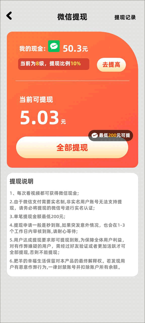 提现比例一目了然,最低提现标准也清晰展示。
