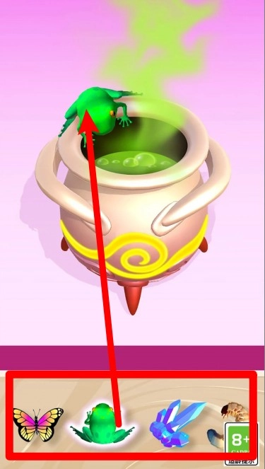 1. 点击下方的素材图标,然后将其拖进魔法锅中,把青蛙、水晶等元素进行融合,如此便能触发神秘的孵化仪式流程。