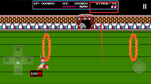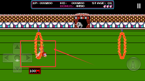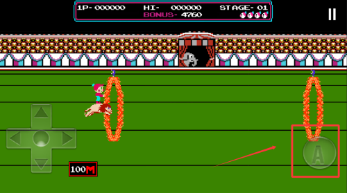 1、控制角色加速跑动,在恰当的时机按下“A”键进行跳跃,穿过火焰圈来完成跳跃动作。