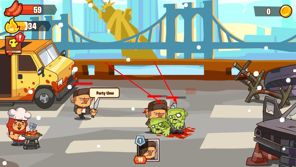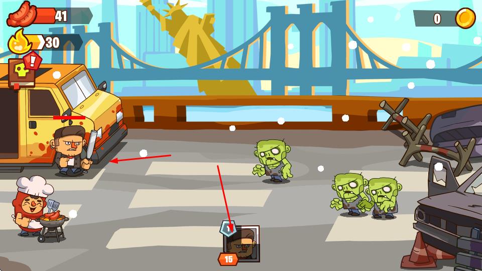 1在街头场景中,点击部署角色,将其移动到僵尸的路径上,角色会自动攻击并清除僵尸潮。