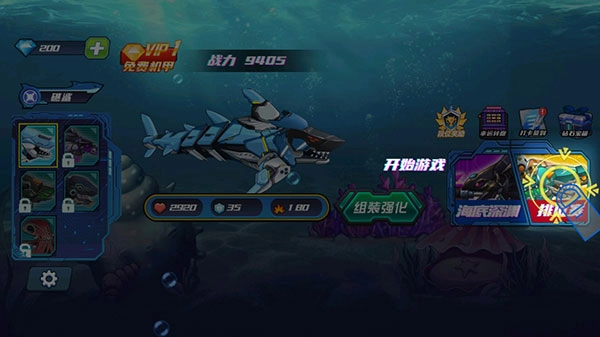 2、吞噬与成长:游戏核心玩法为吞噬海洋生物。玩家需操控机械鲨鱼于海底世界捕食,借由持续吞噬获取经验值与资源,以此提升自身等级与实力,解锁更多强力技能与装备。