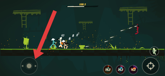 1、在战斗界面,通过左侧的摇杆(箭头指示)来操控角色移动,以避开敌人的攻击,并接近目标(红色敌人)。