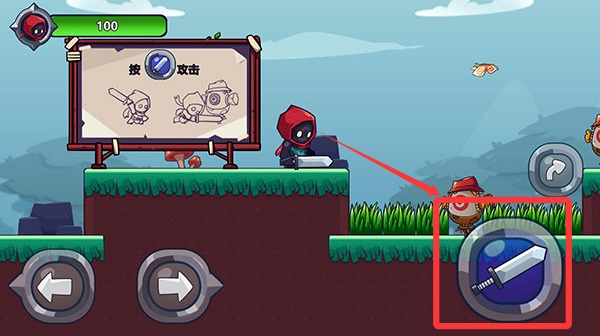 3、右下角的剑按钮是攻击键,是近战攻击的绝佳武器,可以用稻草人试试威力。