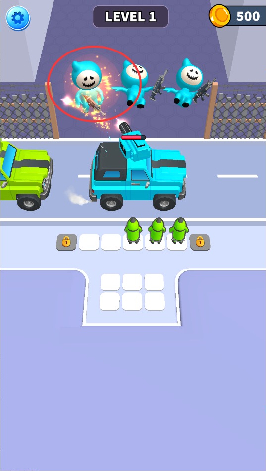 2、精准射击操作,点击武器发射对应颜色子弹攻击敌人,需要准确判断射击时机和角度。错误攻击会导致敌人逼近。