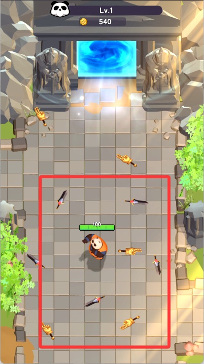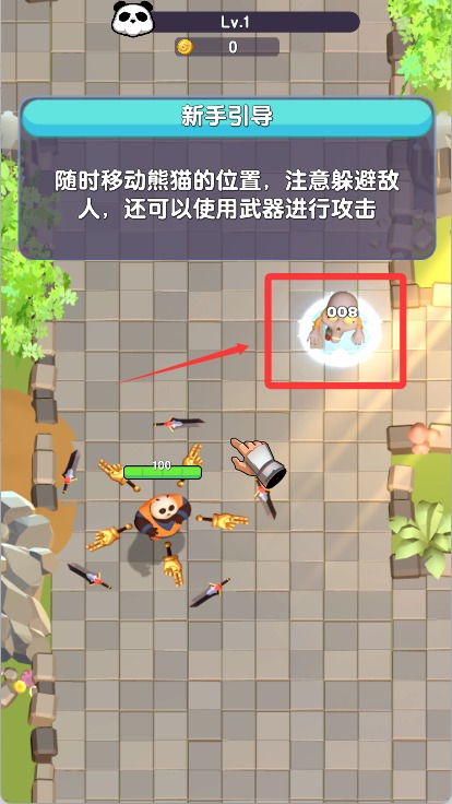 2、随时移动熊猫的位置,注意躲避敌人,也可以使用武器进行攻击。