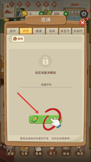 2、店铺建设:点“店外”→“店铺”,解锁“大厅”等区域,花3000货币装修提升评分。