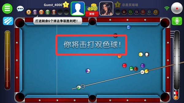 3、开局根据进球的颜色来区分你与对手的击球类型,分为双色球和全色球。