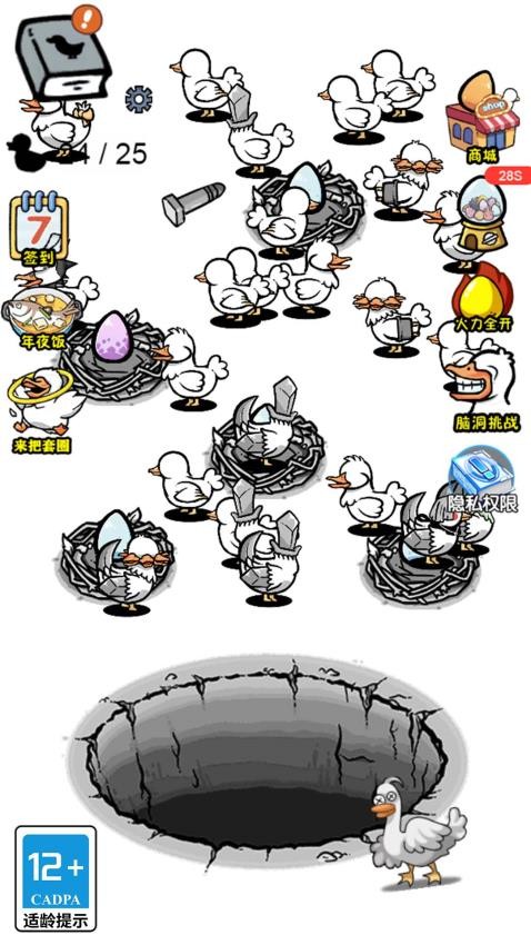 1、创新的基因融合系统让每颗鸭蛋都蕴含着无限可能,采用黑洞孵化技术能够培育出300多种奇特变种,从普通的家鸭到机械战斗鸭一应俱全。