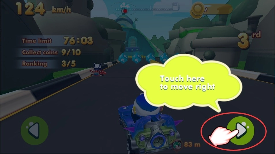 2、右侧相应区域负责控制右转,与左转操作相配合,使得在复杂赛道上能够灵活穿行,避开障碍物和其他对手。