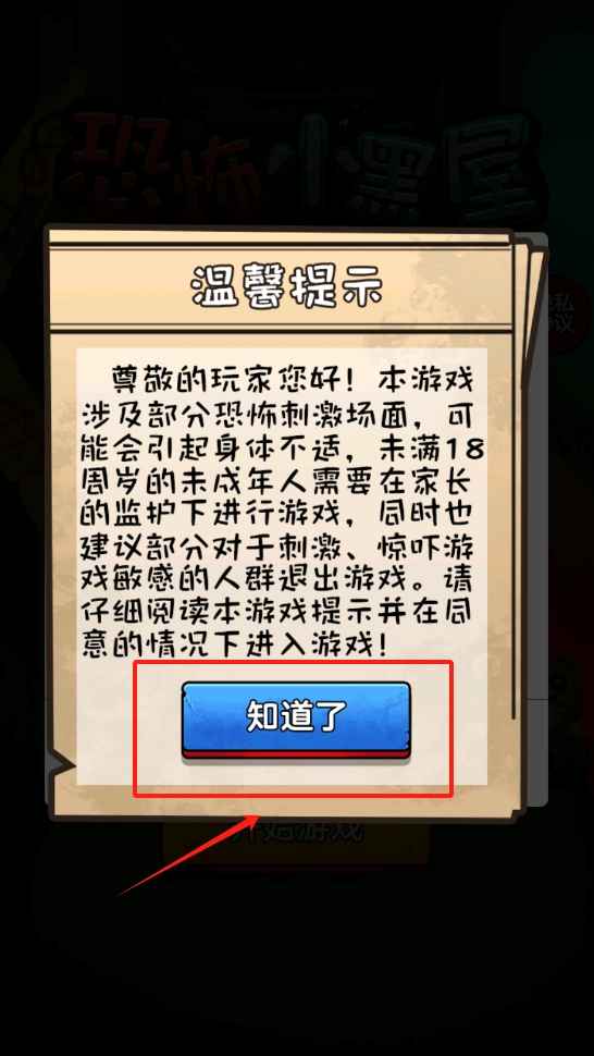 1. 点击蓝色的“知道了”按钮关闭提示,随后点击“开始游戏”进入游戏。