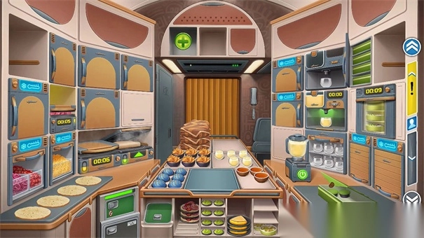 3、游戏场景包括制餐区和客舱区,玩家需要在制餐区内完成所有食物的准备工作。可以通过点击屏幕右侧的按钮快速切换到客舱区来了解乘客的需求,然后再返回制餐区继续准备,以保证能够及时为顾客提供餐点。