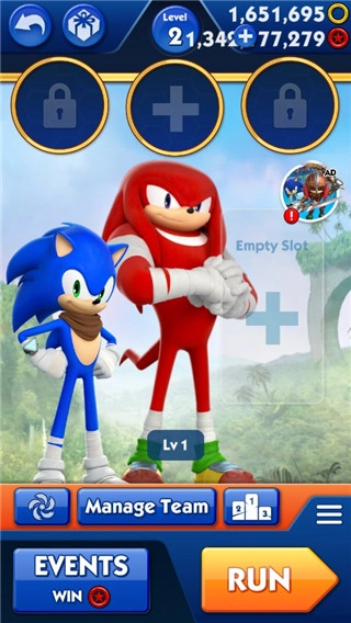 3、游戏主角是为大家所熟悉的经典角色,游戏提供了刺猬索尼克、狐狸塔尔斯、针鼹纳克尔斯以及刺猬艾咪罗斯等四个角色供大家选择,当然除了我们的索尼克之外,其余三位角色需要解锁才能使用。