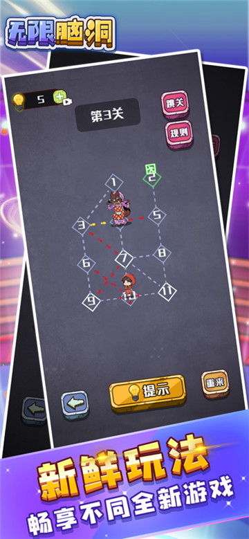 1、无限脑洞游戏的独特之处,体现在创新的设计与别具一格的题材上。游戏里的谜题以及关卡设计极富创意,每一个关卡都具备各异的题材与背景,能让玩家体会到多样化的挑战与乐趣。