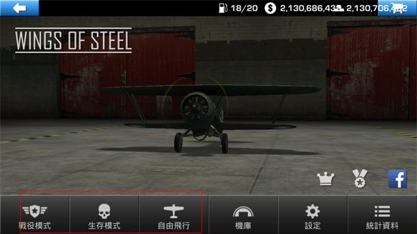 1. 第一步,打开钢铁之翼的最新版本,点击进入游戏后,能看到三种模式,分别是战役模式、生存模式以及自由飞行模式。点击机库,就能够更换飞机。