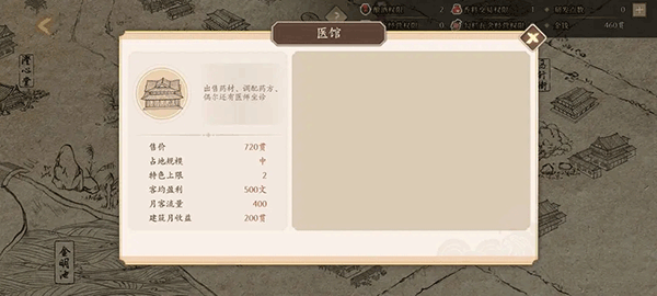 开局产业优先买医馆,医馆是除香料铺之外所有中型地产中性价比最高的。地产最好买在同一个地区内,有连锁加成。