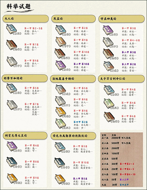 试题都需要四书五经作引论,不然必落榜,所以未有官职前,行动点数都花去太学拿书。(概率看脸)