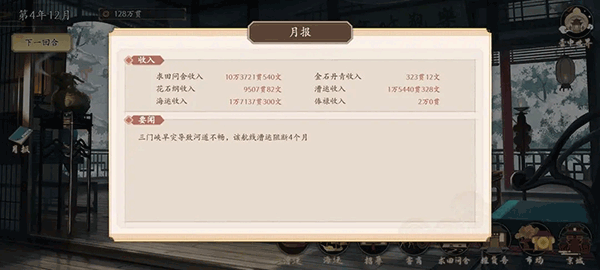 先求田问舍,一次性买满五个。每个回合都必定进行刷新操作,一旦出现收益更为可观的产业,就果断卖掉原有的产业进行置换。每个回合优先考虑土地置换,剩余的钱再拿去市场做高抛低吸的操作。等月收入稳定达到几百贯时,要是对自身血统有信心,就可以考虑参与澄心堂的金石丹青活动,每次需花费100贯进行尝试。