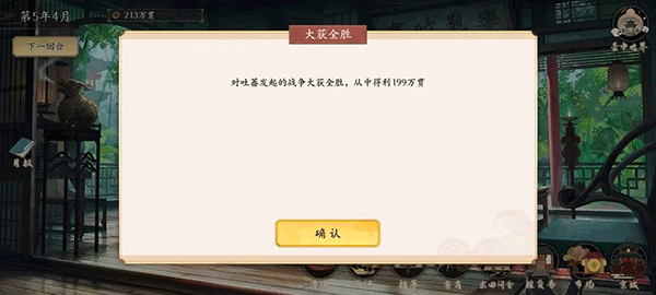 当你拥有了三家连坐的青楼和两家质库,你需要做的只有一件事情,那就是按左上角的按钮跳过回合。