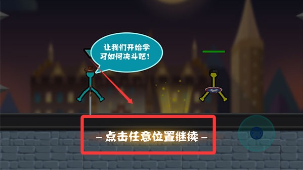 1、进入游戏后先熟悉一下操作,点击屏幕任意位置继续。