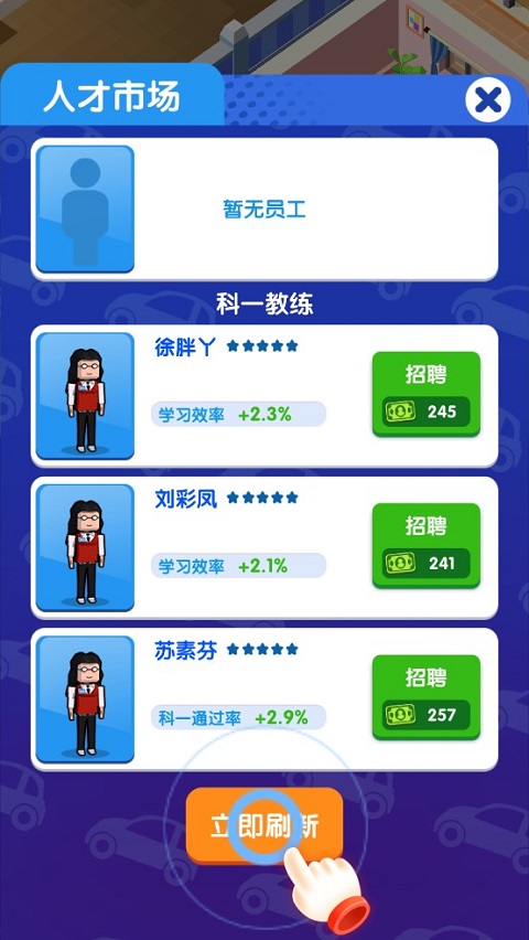 5、针对不同阶段的科目进行模拟练习,这同样要求员工在岗。具体操作方式与之前相同,即前往人才市场开展招聘工作。在此过程中,我们能够通过点击刷新功能,寻觅到更为高级的员工。