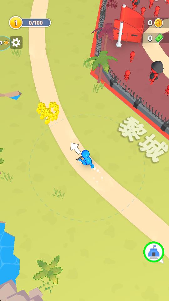 1、控制蓝色火柴人沿着路径前进,收集金币(黄色的堆),探索黎城、冈城等地方。