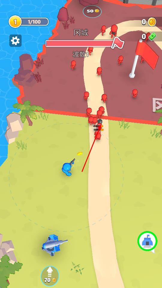2、消耗金币(70、50)建造/升级炮台、飞机,布置在路径旁,攻击红色火柴人敌人。