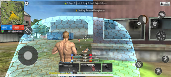 5、下来之后控制虚拟键让人物进行移动,并拾取地图的枪械武器来消灭其他对手;