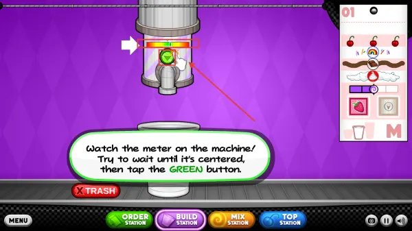 2、点好餐后,进入制作台,机器上的进度条达到绿色区域时,按下绿色按键即可。