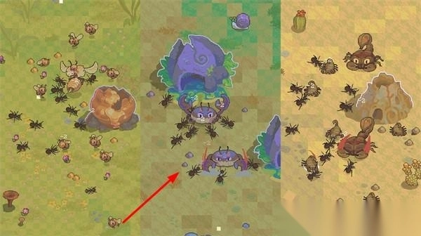 3、危险生态对抗玩法:在探索过程中遭遇蜘蛛、蝎子等节肢动物时,需根据敌人特性调整战斗策略,如利用兵蚁的群体冲锋对抗单体强敌,体验弱肉强食的生存法则。