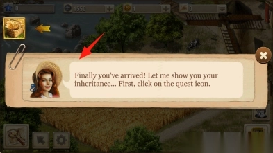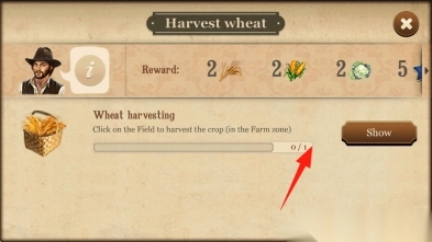 1、按照指示点击任务图标,接受“Harvest wheat”任务,然后前往农场区域的麦田。
