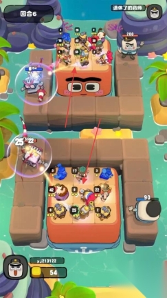 2、回合战斗中(回合5/6),消耗金币部署角色到战场,利用技能、属性,对抗敌方单位。