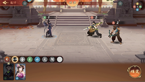 6、根据对手的人数和属性“布阵”,点击选择对应的角色上场;(上场后需要根据角色的战斗特质,安排合理的站位哦)