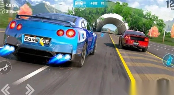 3、比赛时,通过左侧方向键操控蓝色赛车,挡位2阶段瞅准时机超越紫色对手,必要时触发【氮气】,冲击更优名次与圈速。